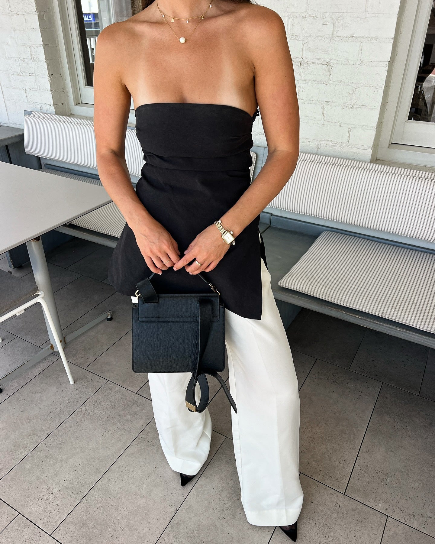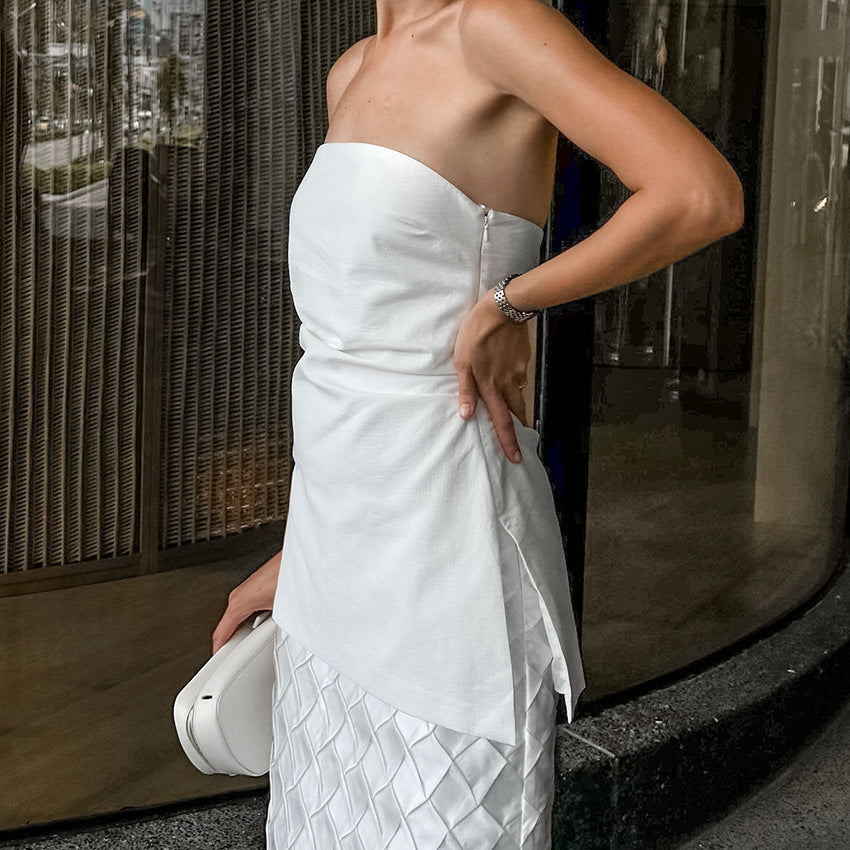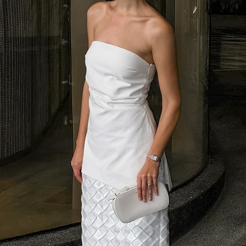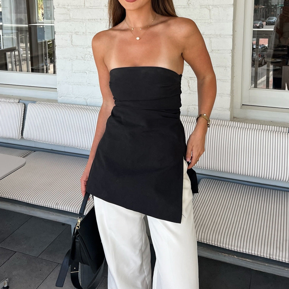 Design: Tube top with an irregular hem and no back detail, featuring a modern, fashion forward silhouette.