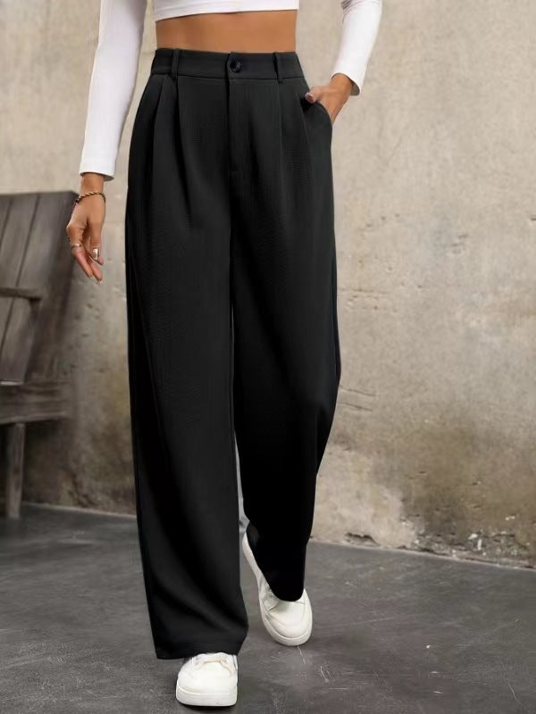 Design: High waist straight leg trousers featuring subtle folded details and a wide leg silhouette for a polished yet relaxed look