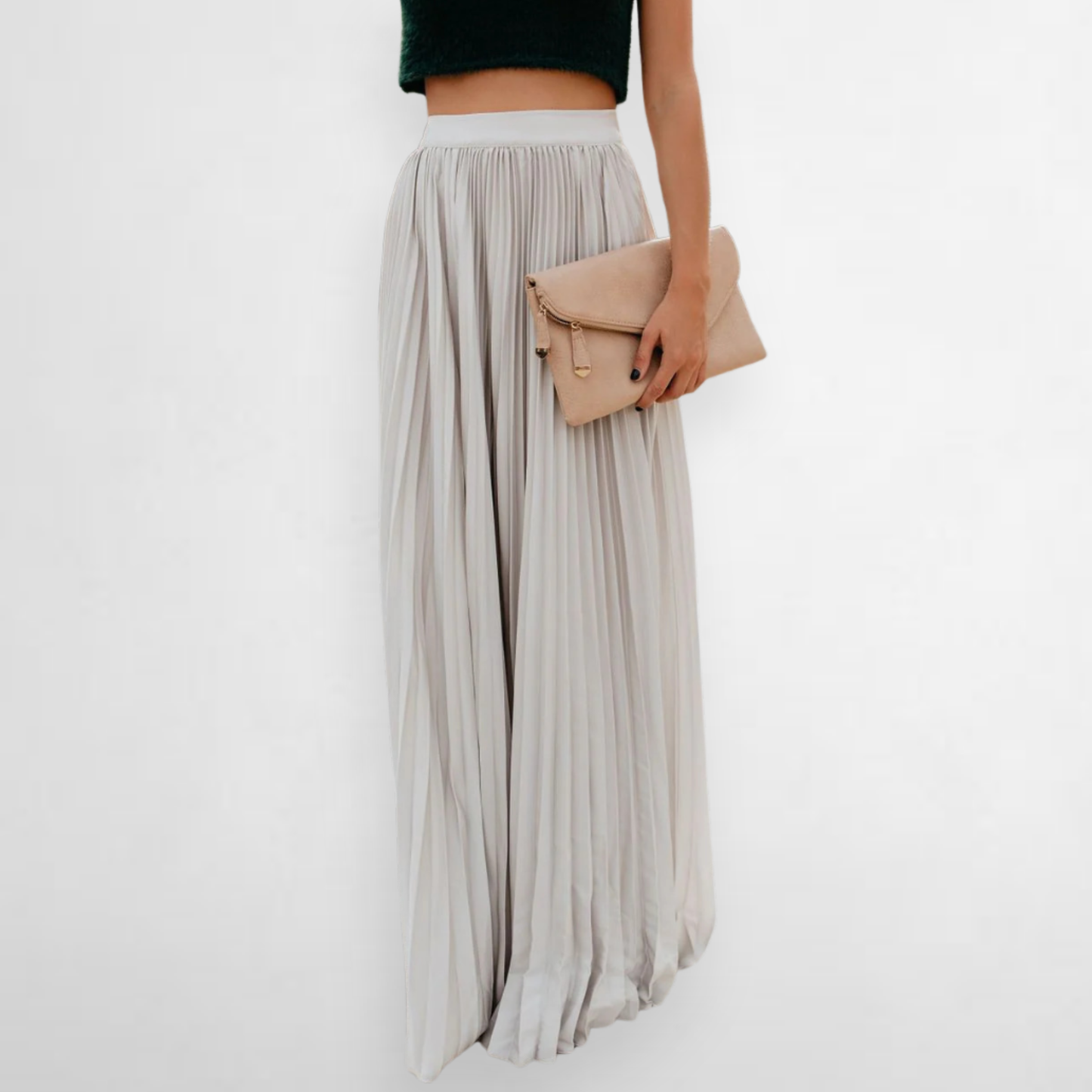 Design: A high waist pleated skirt with a clean, flowing silhouette, designed to create an elegant and feminine look for everyday wear.