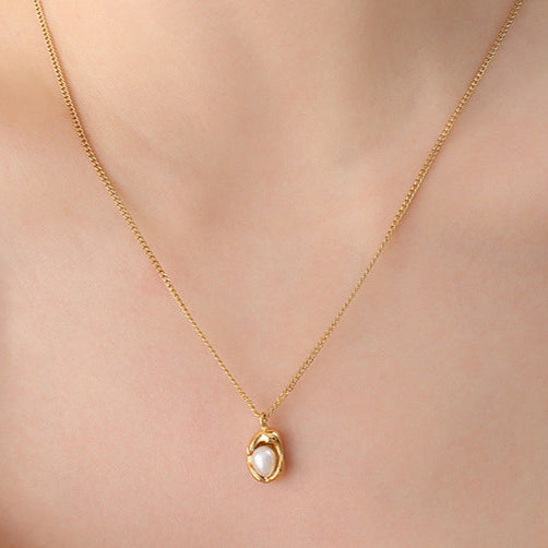 Design: A refined link chain paired with a geometric pendant delicately inlaid with natural freshwater pearl. The pendant measures 1.4 cm high, adding subtle detail while keeping the silhouette elegant and balanced.