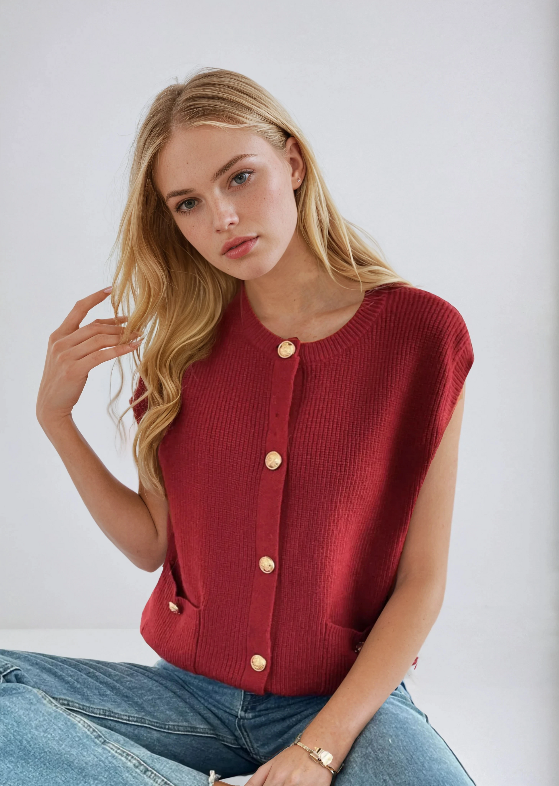 Design: Casual sleeveless knitted sweater with a classic round neckline and subtle buckle detail for a modern twist on a timeless piece.