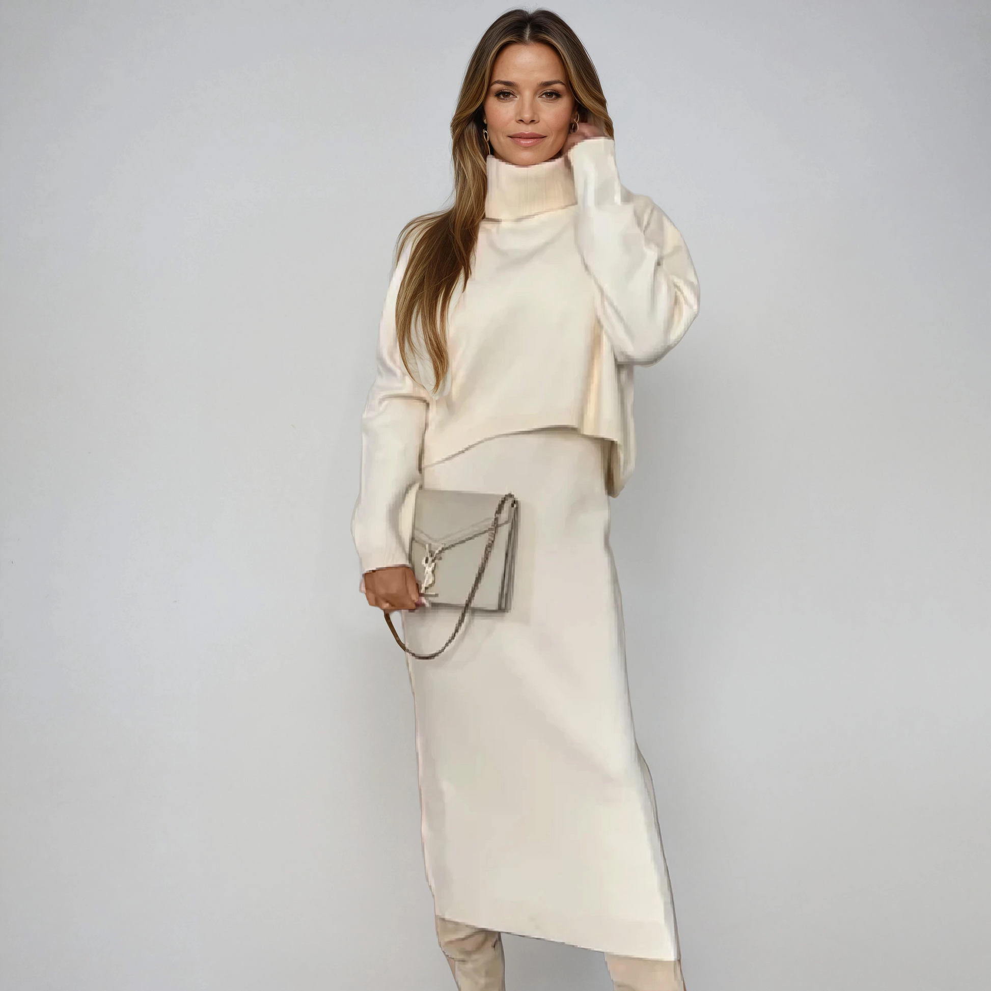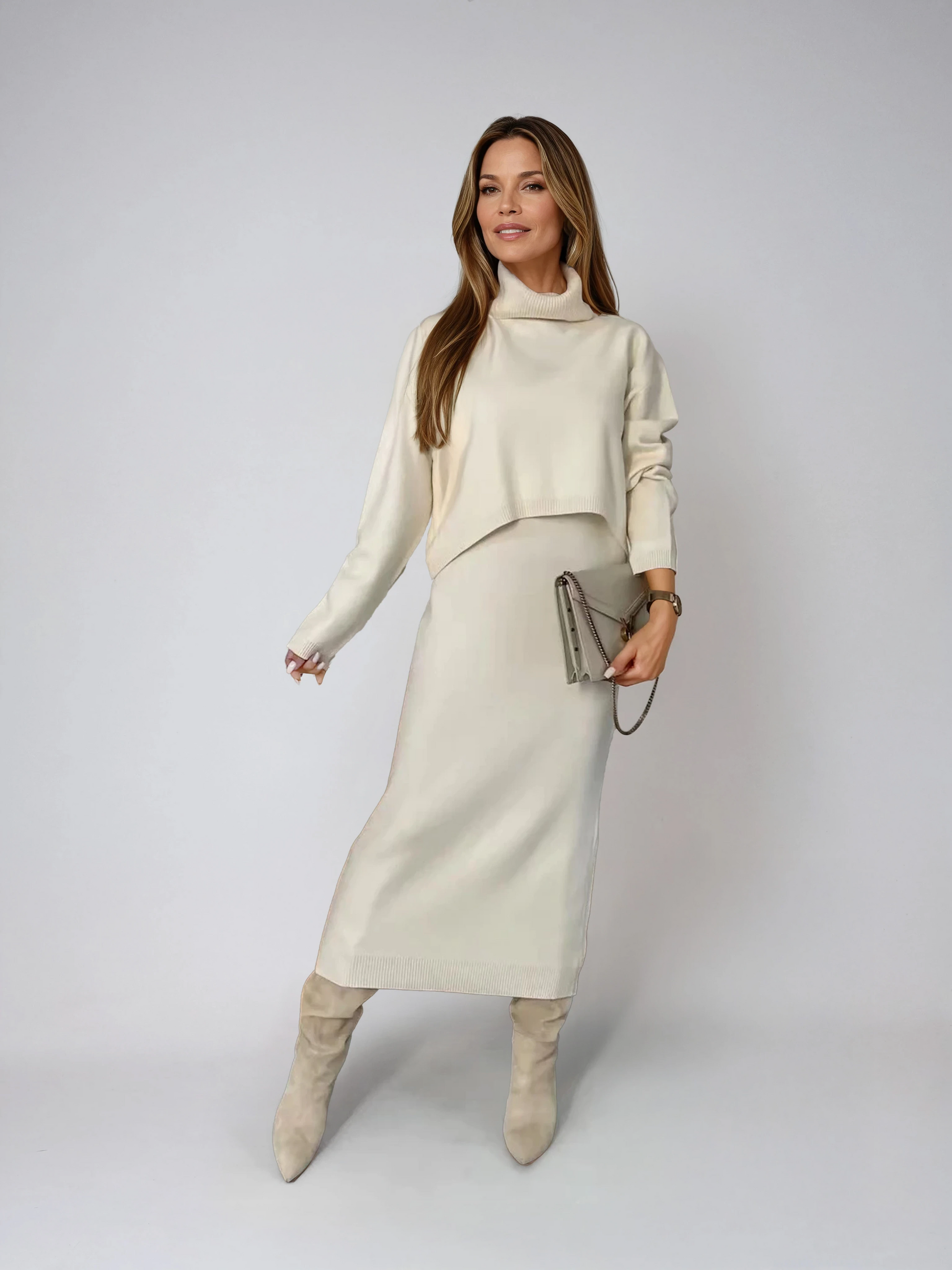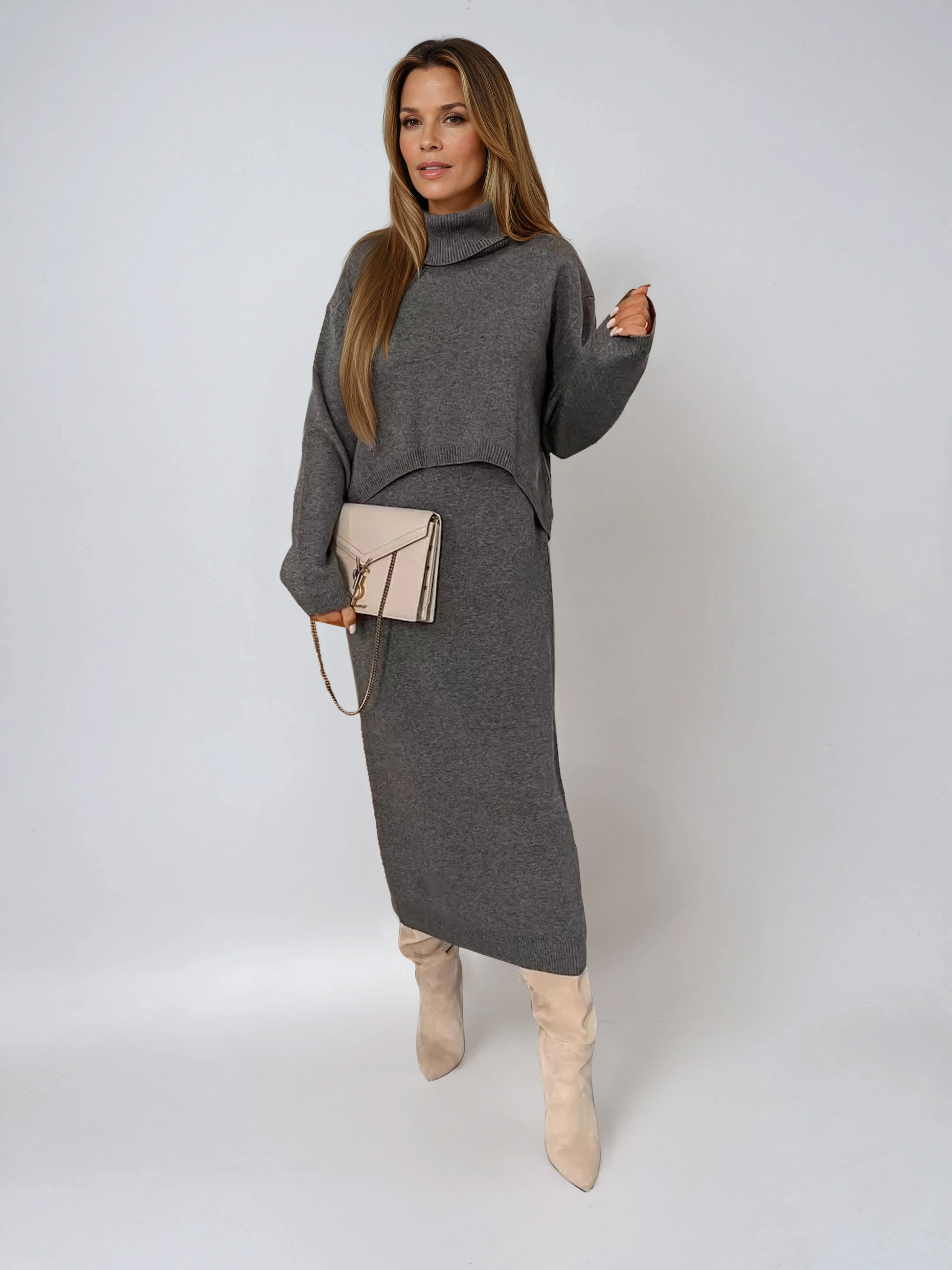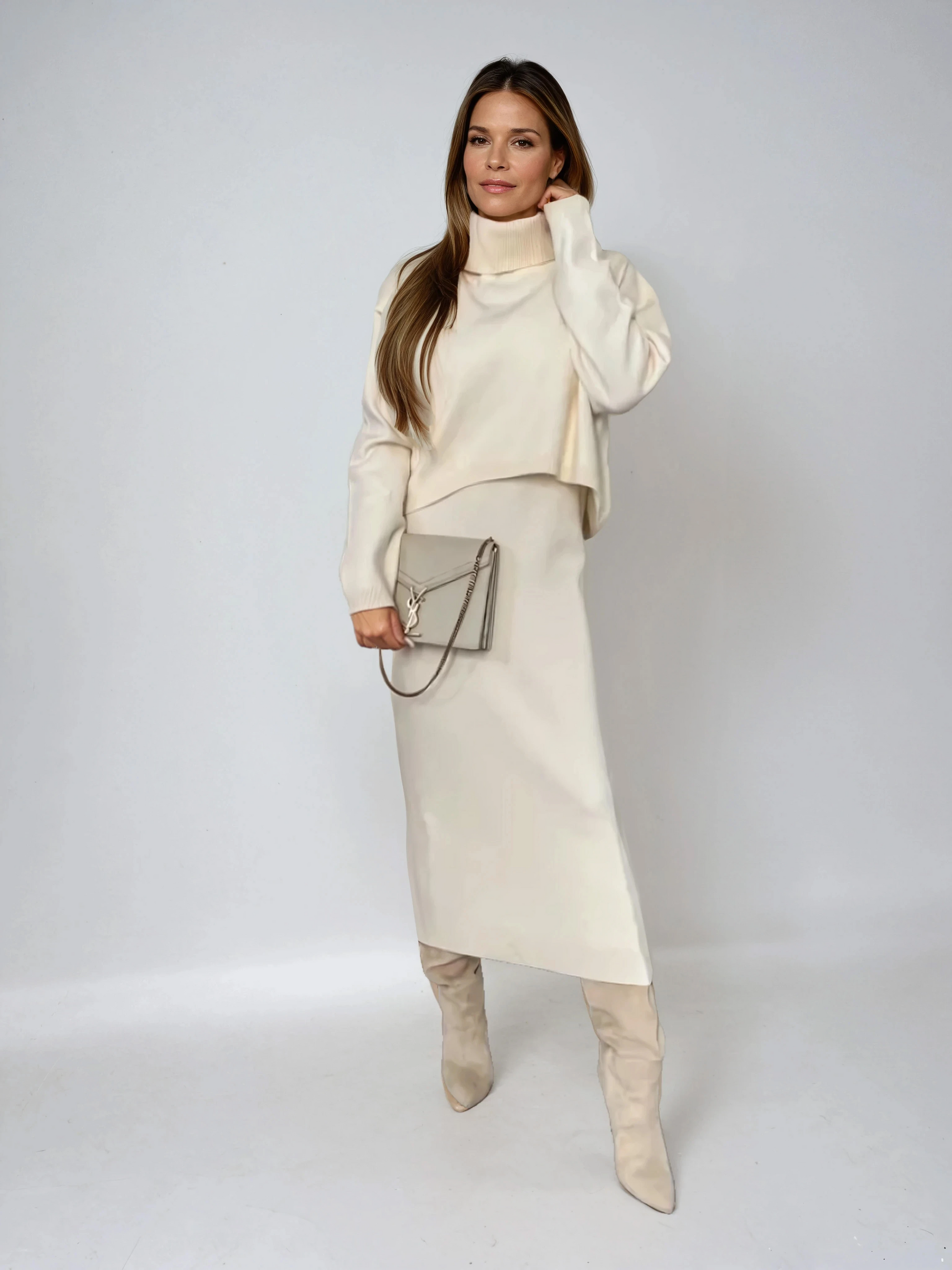 Design: A cozy two piece set featuring a turtleneck pullover paired with a knit maxi skirt, combining warmth with effortless elegance.