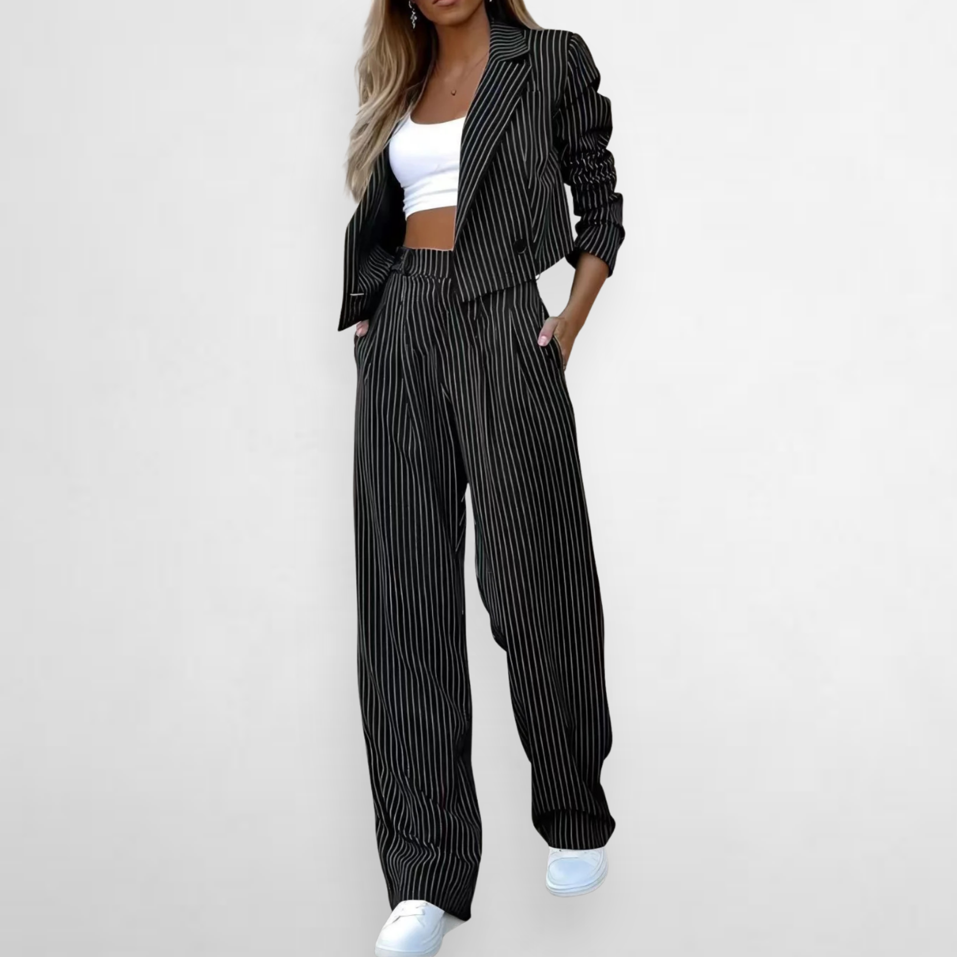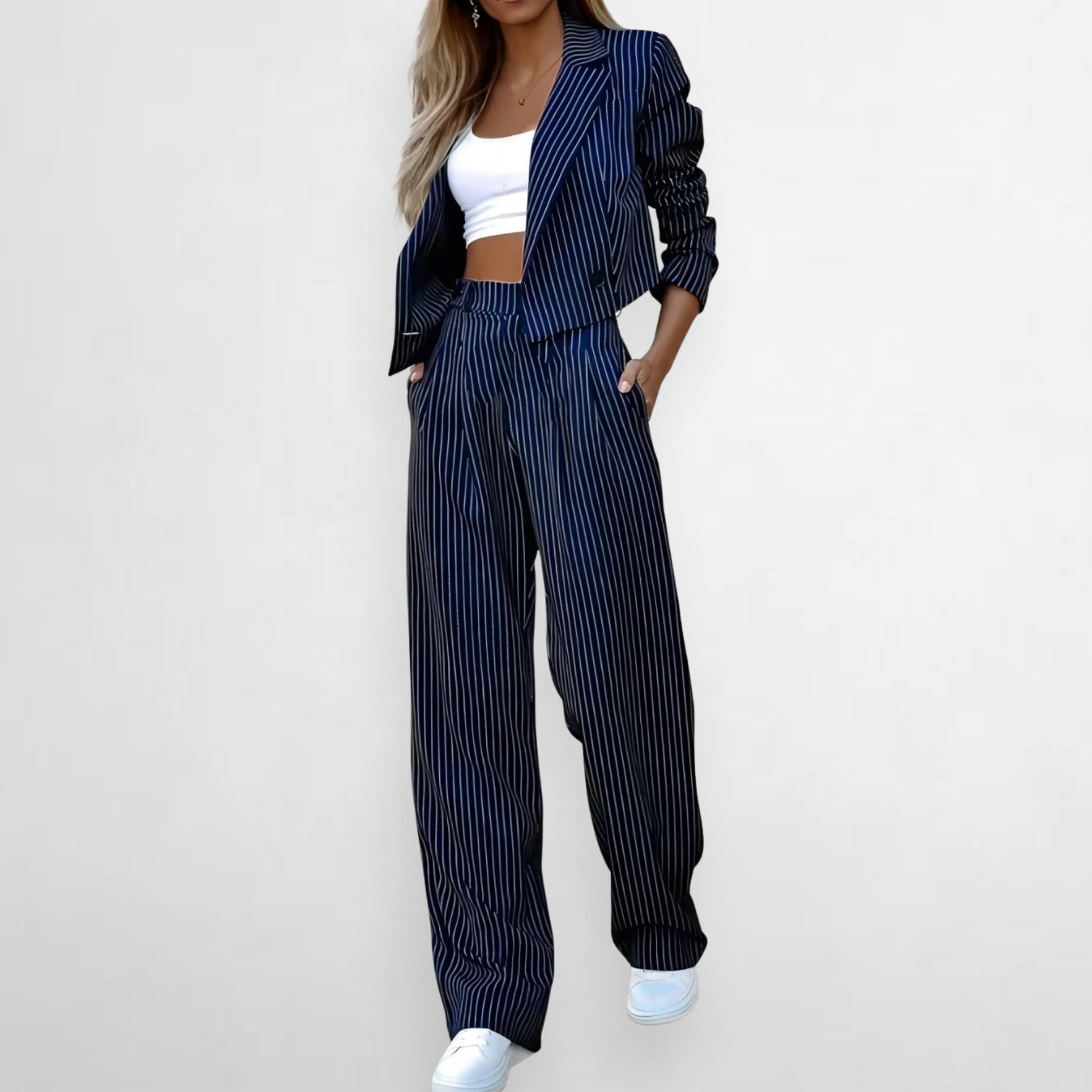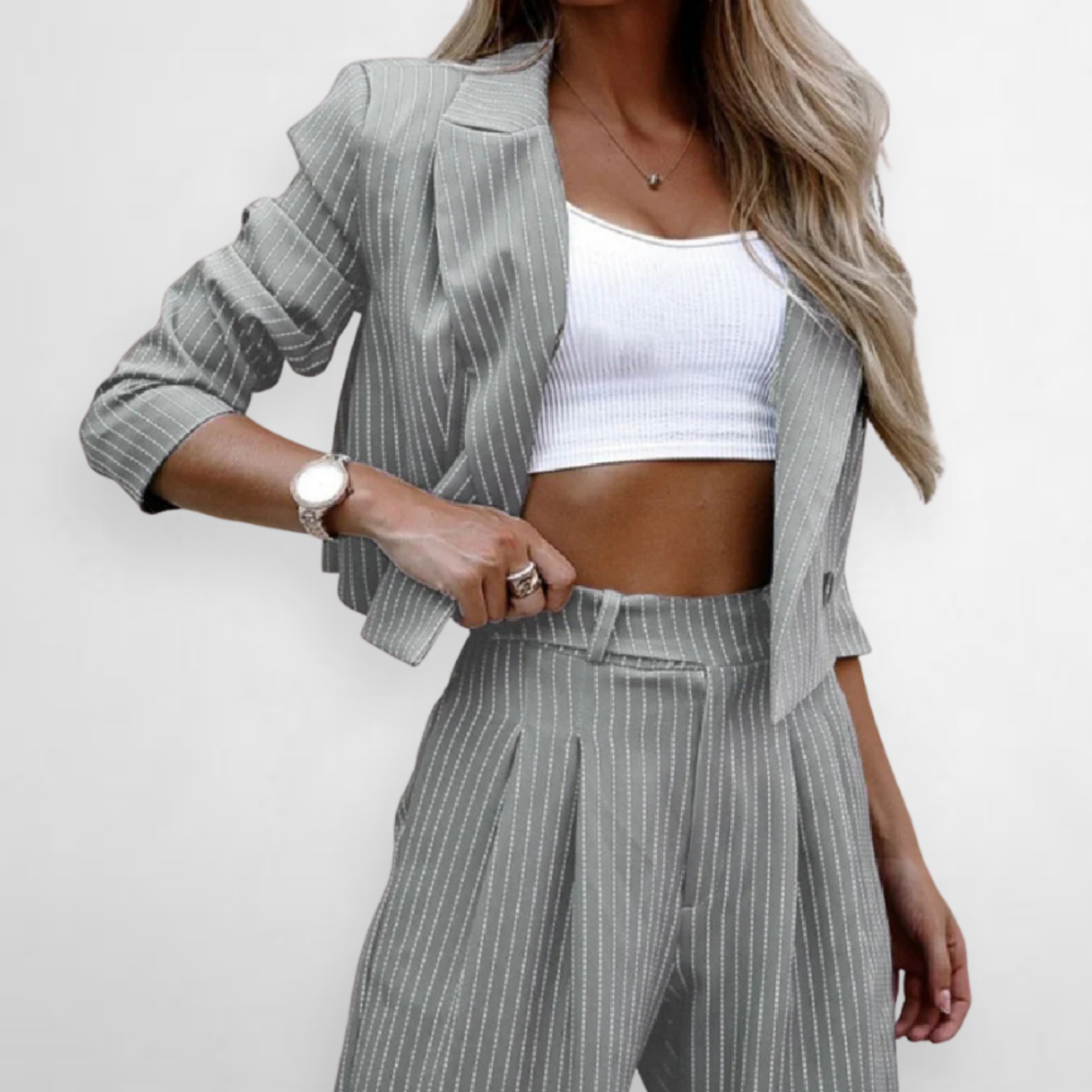 Design: A chic striped two piece set featuring a cropped blazer with straight leg trousers.