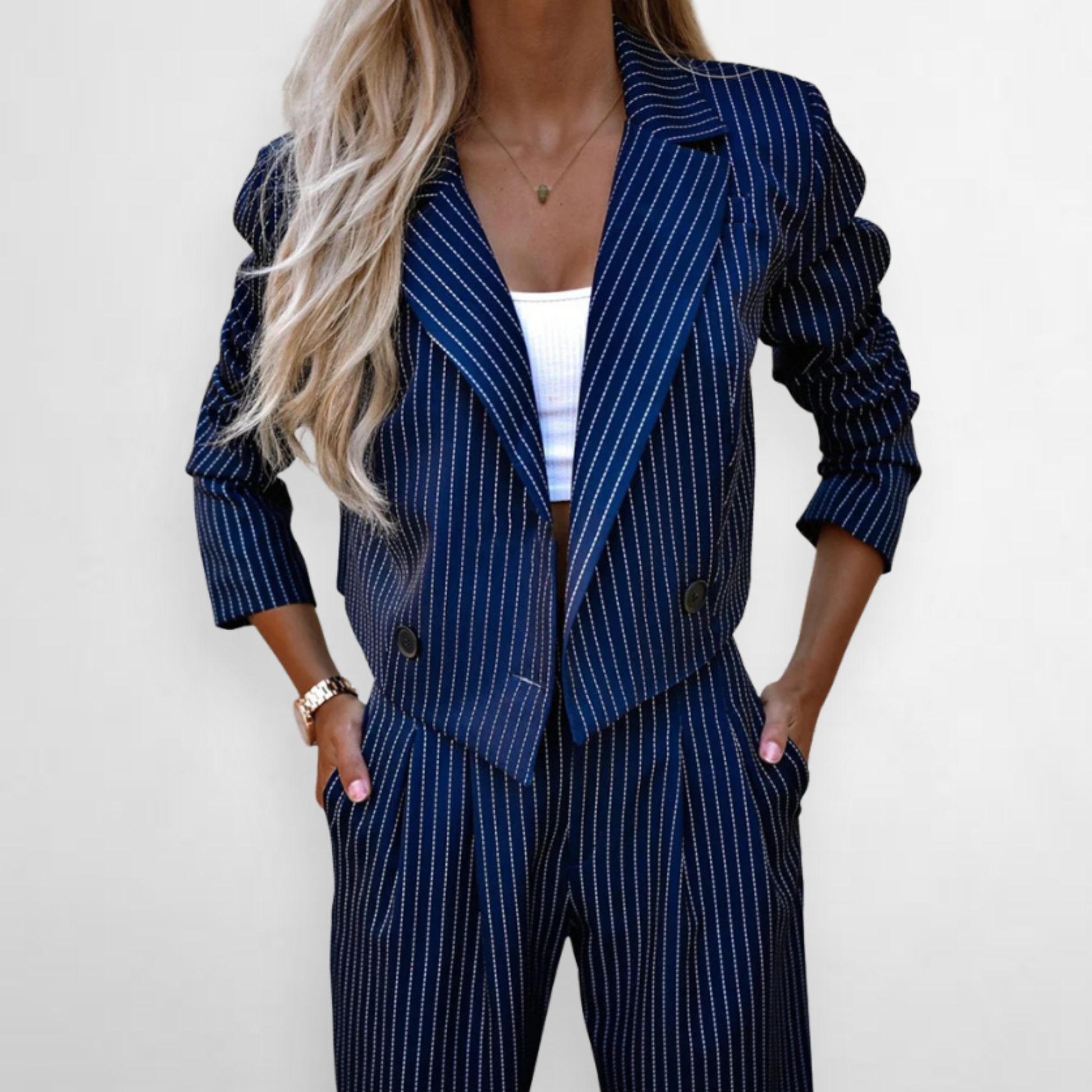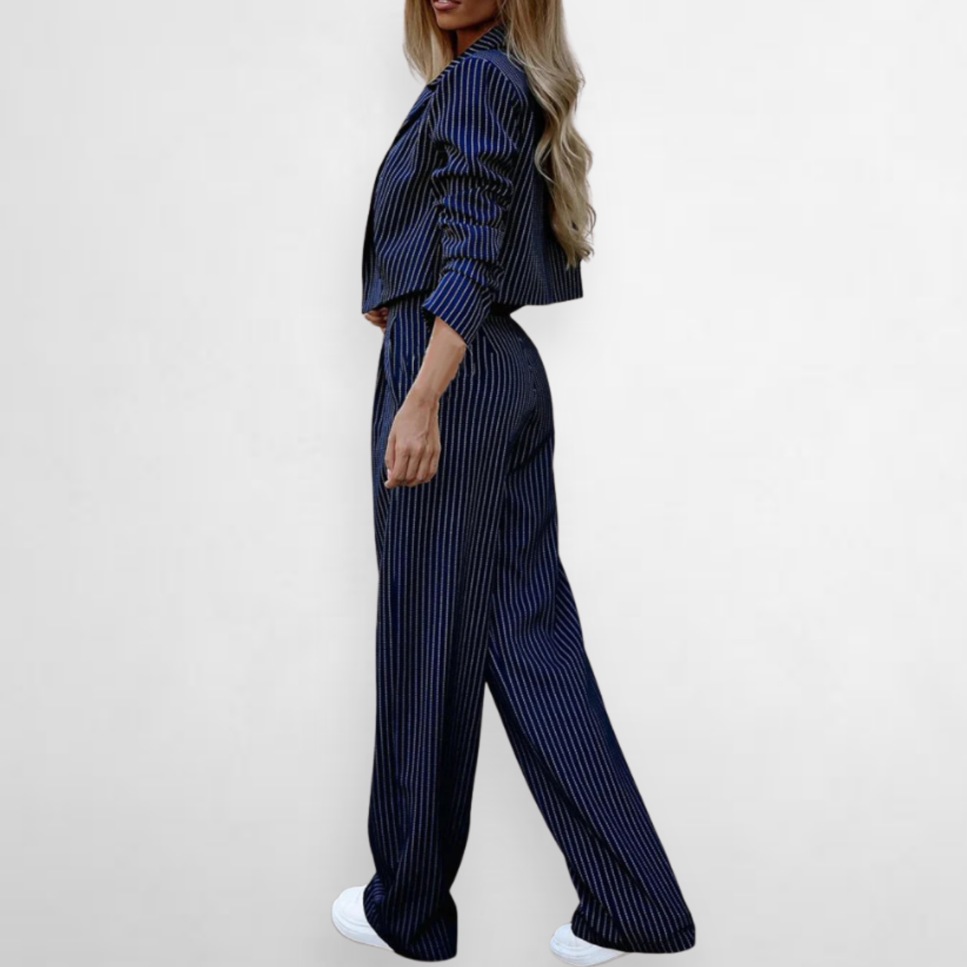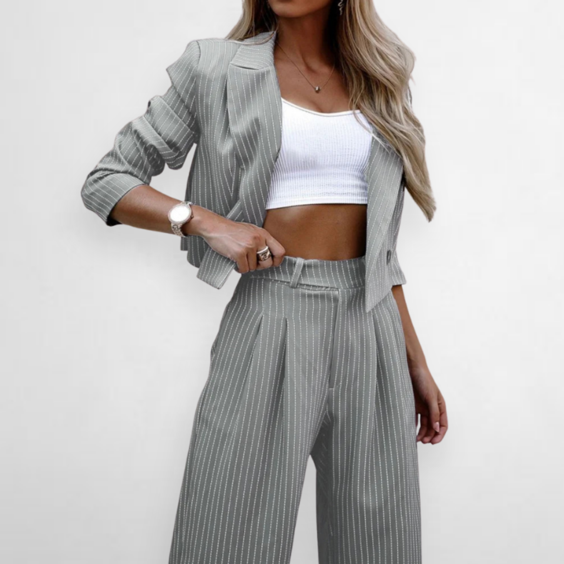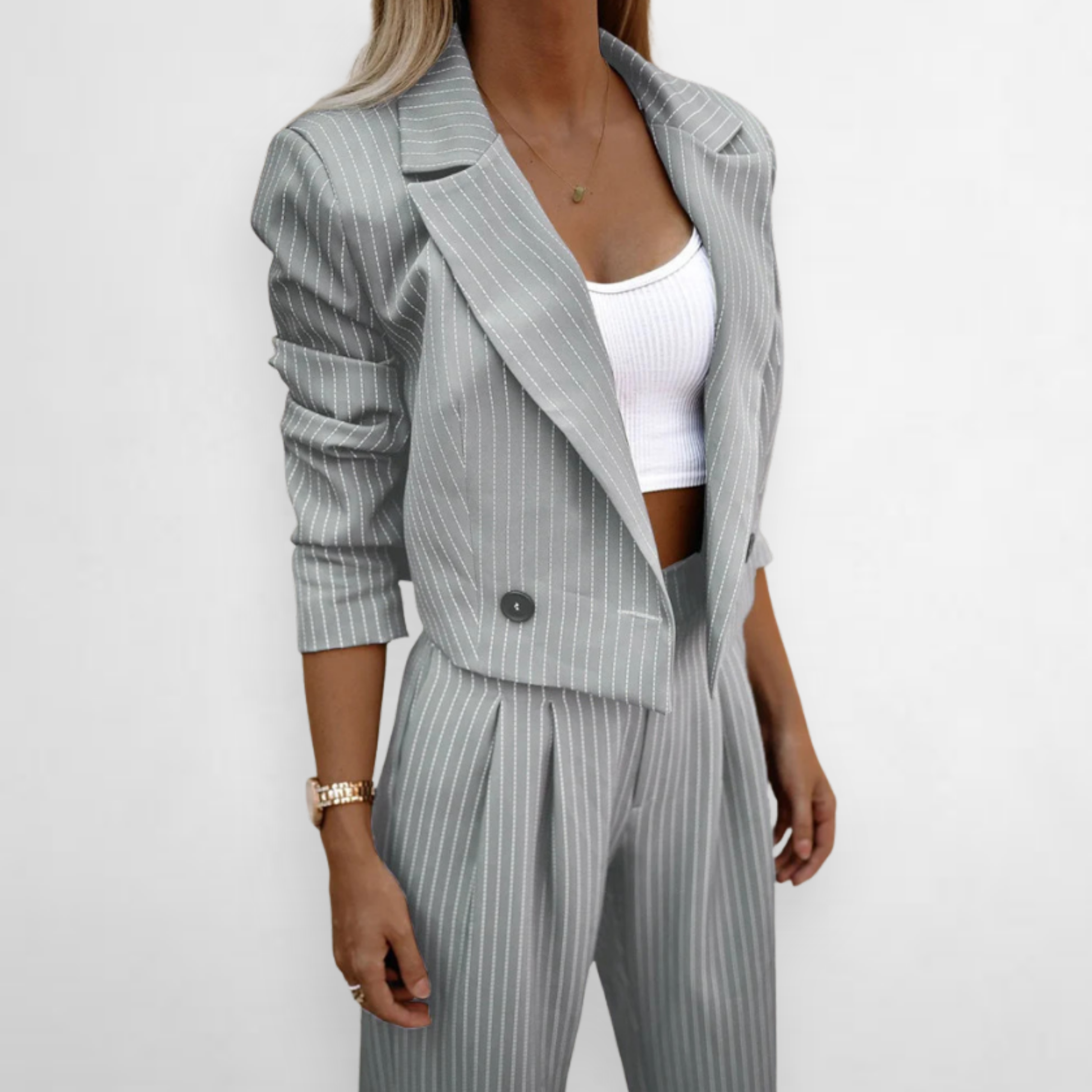 Design: A chic striped two piece set featuring a cropped blazer with straight leg trousers.