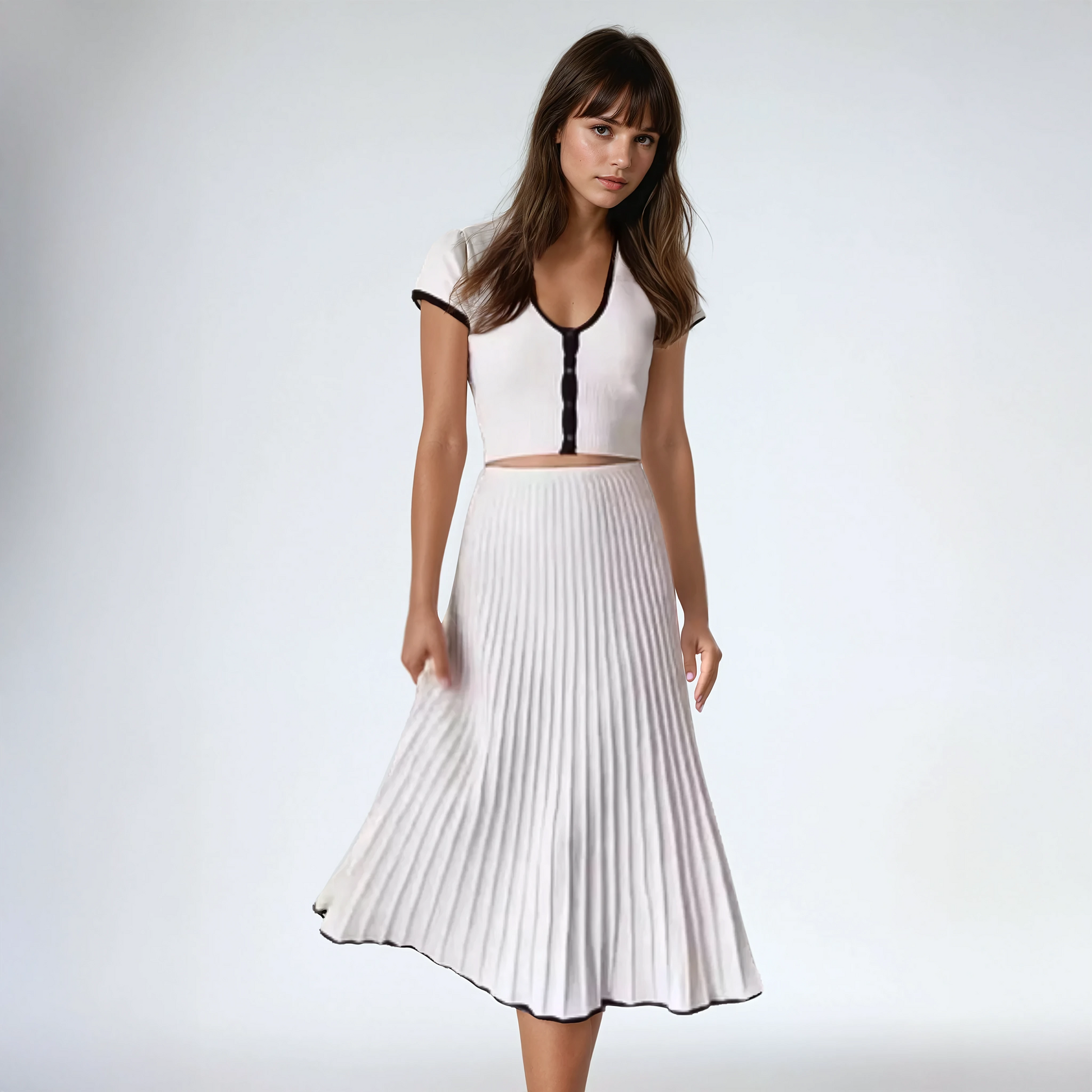 Design: Coordinated knit set featuring a slim V neck top paired with a pleated long skirt, creating a polished yet modern ensemble.